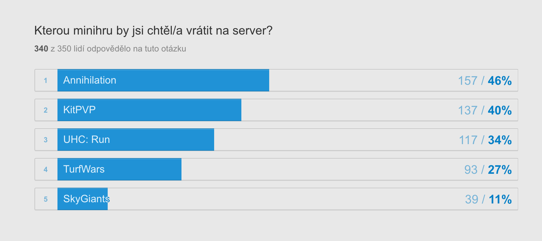 Nu a jak se odhlasovalo, tak tak se taky stane. Do konce roku se na server vrátí Annihilation (možná i MiniAnni), UHC: Run a samozřejmě jsem přehodnotil plány a rozdělil na KitPVP samotný server. KitPVP se vrátí, tak jak ho všichni znají!