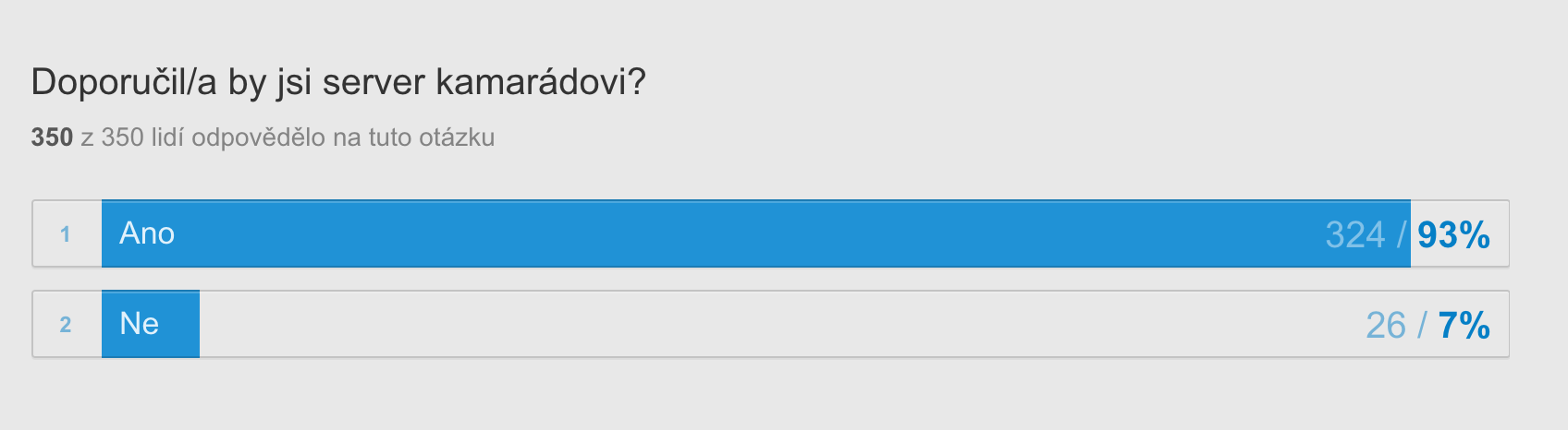 Jakože WOW, opravdu 93%! :emoji_smiley: To je teda masakr, samozřejmě lepší by bylo 100% ale zůstaneme v realitě. Jelikož CM dělají základní reklamu hráči sami, což nejenom potvrdil tento screen ale i dotaz, na to kde jste přišli na náš server. Opět se potvrdila moje pravda! :emoji_smiley: A jsem rád, že CM není server, který by musel mít reklamy na každém rohu, cpát se do škol na tabule a nevím kam jinam, aby měl reklamu. Základ serveru jsou hráči... a pokud dělají největší reklamu hráči? To nám může závidět kde jaký server... opět WOW.